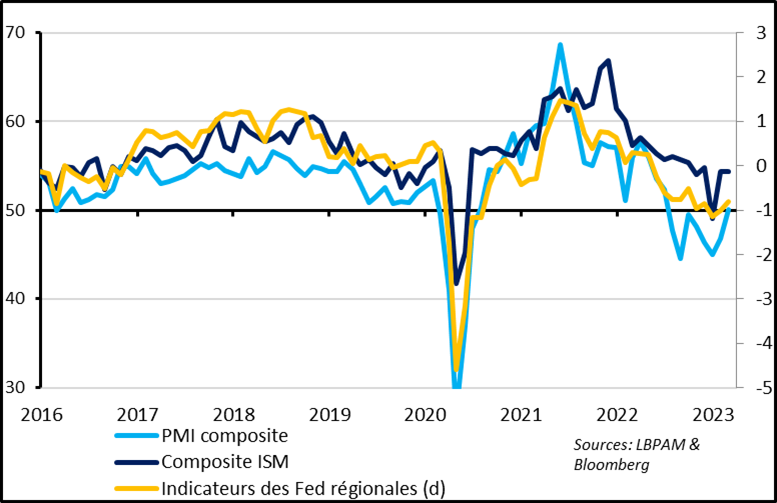 In the US, the ISM services indicator remained stable in February after rebounding in January, to 55.1 points. This is encouraging, as this indicator had been the weakest since Covid in pointing out the direction of the US economy, in particular vs. the S&P Global PMIs and the regional Fed indicators, which remain lower. All in all, the ISM composite for services and manufacturing was stable in February at its historical average. This confirms that the US economy is growing at a reasonable pace so far in 2023 and that the positive signs in January were not due merely to seasonal effects.