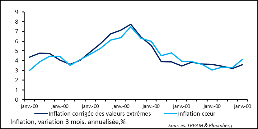 Ces tensions et la viscosité de l’inflation sont bien visibles sur les indicateurs sous-jacents de l’inflation et dans leur dynamique récente. Ainsi, au cours des derniers mois, la banque du Canada a constaté que l’inflation sous-jacente ne baisse plus comme attendu, et que les variations de court terme sont même allées dans la mauvaise direction. Ainsi, l’inflation cœur (hors énergie et aliments) ou l’indice corrigé des valeurs extrêmes (c’est-à-dire en excluant les prix que baissent ou montent le plus) sont même repartis à la hausse.