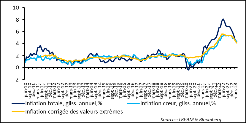Néanmoins, nous tablons toujours sur une croissance du PIB faible, mais positive, pour les trimestres à venir, reflétant le maintien de conditions monétaires restrictives et la perte de soutien du côté des finances publiques. Dans le débat sur la poursuite ou pas du resserrement monétaire, soit celui de savoir si les politiques monétaires sont suffisamment restrictives pour venir à bout de la poussée de l’inflation, la Banque du Canada (BoC) a montré que la lecture de la conjoncture restait difficile. En effet, la BoC a décidé d’interrompre sa période de pause, qui durait depuis la dernière hausse de taux directeur du mois de janvier, pour le remonter de 0,25pb, à 4, 75%.