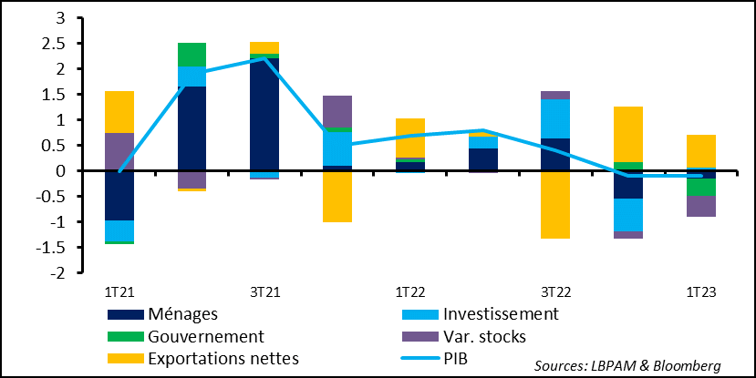 Au regard des dynamiques sous-jacentes expliquant la croissance du PIB, on voit que le commerce extérieur est resté un des moteurs de la croissance, alors que la demande interne a fléchi, notamment avec des dépenses des gouvernements en retrait. La bonne nouvelle, si on peut dire, est que l’investissement a apporté une légère contribution positive ce qui encore une fois reflète que la dynamique de croissance n’avait pas la caractéristique classique d’une récession. En revanche, à la différence des Etats-Unis, la consommation des ménages a de nouveau contribué négativement à la croissance, même si moins qu’au 4T22. Le sursaut du secteur des services, comme l’indiquent les PMI, semble bien confirmer que la consommation s’est redressée, notamment aidée par une amélioration du pouvoir d’achat apportée par la baisse des prix de l’énergie.
