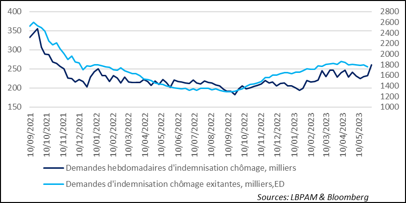 Alors que le dernier rapport emploi pour le mois de mai aux Etats-Unis a été plus favorable qu’attendu, les derniers chiffres sur les demandes d’indemnisation chômage ont surpris fortement à la hausse. En effet, avec 261 mille demandes hebdomadaires d’indemnisation chômage la semaine dernière, on atteint le chiffre le plus important depuis octobre 2021.