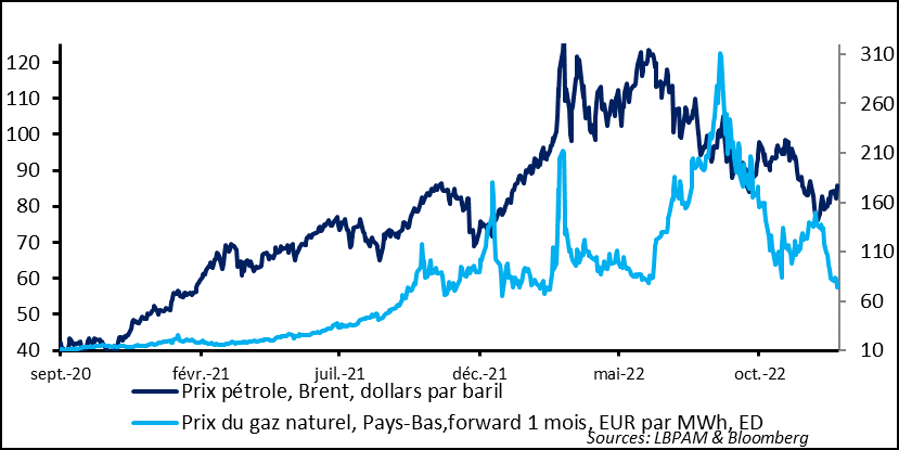 Les prix de l’énergie restent une des clés pour la dynamique économique à venir et reflètent aussi les tensions qui persistent concernant la guerre en Ukraine. Les prix du pétrole ont repris leur marche ascendante depuis le début décembre 2022. Ceci traduit la résilience de l’activité économique mondiale, mais aussi des perspectives d’offre de brut qui pourraient s’avérer moins favorables. Parmi ces facteurs on trouve le fait que les Etats-Unis ont décidé de recommencer la reconstitution de leurs réserves stratégiques après les avoir réduites constamment depuis des mois afin de peser à la baisse sur les prix. Aussi, l’incertitude sur le pétrole russe reste forte. De combien l’offre de brut russe sera-t-elle coupée ? Entre l’effet du plafond sur les prix du pétrole russe, imposée par le G7, et les mesures de représailles de la Russie de réduire sa production, il est difficile d’avoir de la clarté sur l’équilibre entre offre et demande. En même temps, alors que le prix du pétrole monte, le prix du gaz en Europe baisse. En effet, les stocks importants de gaz qui ont été constitués et une demande qui se modère, notamment grâce à des conditions climatiques favorables, a permis de retrouver un prix de gros pour le gaz autour de celui qui prévalait avant le début de la guerre en Ukraine. C’est une bonne nouvelle pour les Etats européens et pour les économies de la région.