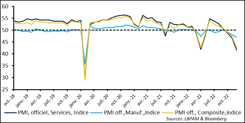 Ainsi, le taux sur les Treasuries américains à 10 ans a monté de plus de 40 points de base (pb) sur la période, alors que celui des Emprunts allemands gagnait plus de 60pb, soit atteignant le niveau le plus haut de l’année 2022 à 2,6%. Cette hausse n’a évidemment pas plu aux bourses qui ont perdu du terrain. Ces dynamiques sont en ligne avec notre diagnostic d’un début 2023 difficile pour les marchés. L’horizon devrait s’éclaircir dans le courant de l’année, mais la prudence dans l’allocation d’actifs reste pour l’instant de mise d’après nous. La question de l’inflation reste un des sujets majeurs. Pour nous la question n’est pas si l’inflation va baisser en 2023. On en est convaincu. Le sujet est la vitesse avec laquelle ce recul va se faire. Les banques centrales des deux côtés de l’Atlantique attendent une décélération de l’inflation graduelle, d’où leur vigilance. Alors qu’au niveau des biens, les prix se tassent grâce à une moindre demande et la disparition de goulets d’étranglement, sur les services la progression des salaires devrait empêcher une baisse rapide. Les chiffres d’inflation en Espagne, pour le mois de décembre montrent que si bien le prix de l’énergie baisse, l’inflation sous-jacente continue de progresser, à 6,9% en glissement annuel contre 6,3% en novembre. Aux Etats-Unis, l’indicateur préféré de la Fed, de déflateur de la consommation a reculé mais à une vitesse moindre que prévu, avec l’inflation cœur à 4,7% en glissement annuel, contre 5% le mois précédent. L’inflation va entamer son reflux d’autant plus rapidement que la croissance économique va perdre de sa vigueur. Sur ce point, on constate que la croissance a été bien plus résiliente qu’attendue en Zone Euro comme aux Etats-Unis ces derniers mois. Les PMI de S&P comme les enquêtes nationales montrent que nous subissons une contraction légère de l’activité en Zone-Euro, en dépit des chocs subis. Les aides des gouvernements, essentiellement pour atténuer le choc énergétique, semblent contenir de manière marquée l’ajustement de la demande. Ceci permet, notamment, que le marché de l’emploi reste résilient. Un constant similaire est visible aux Etats-Unis, avec même une accélération de l’activité en fin d’année, et ce malgré des indicateurs avancés qui se détériorent. La force du marché du travail est là encore une source importante de cette résistance de la demande. Ce vendredi nous en saurons plus avec la publication du rapport sur l’emploi américain pour le mois de décembre, avec une attente de 200 mille créations d’emplois. En Chine, la croissance reste plombée par la crise sanitaire. Le gouvernement a certes pris la décision de privilégier la croissance au détriment de la situation sanitaire liée au Covid, mais cette dernière pèse tout de même sur l’activité. Le nombre de contagions a explosé, même si les statistiques sont fragiles étant donné que les tests systématiques ont été abandonnés. Les PMI officiels ont confirmé la détérioration de l’activité au mois de décembre, avec une baisse très forte dans les services. Le redémarrage de l’économie chinoise sera très graduel, malgré le changement de stratégie des autorités chinoises.