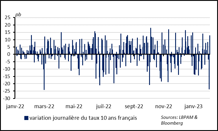 Les taux d'intérêts sur la dette française à un an ont rebondi vendredi de 0,11% après la publicationd es chiffres de l'emploi américain. Cela a annulé plus de la moitié de leur baisse de la veille, la plus forte depuis un an, qui avait suivi la réunion de la BCE jeudi dernier. La réaction des taux allemands et américains a été la même. Nous pensons que les marchés ont surréagi aux déclarations des banques centrales de la semaine dernière. Ils se sont focalisés sur le fait que les banques centrales s'approchent de la fin de leur cycle de hausse de taux et estimaient que les risques inflationnistes avaient légèrement baissé, ce qui les a poussés à anticiper des baisses des taux directeurs dès la seconde moitié de l'année. Mais la Fed comme la BCE ont aussi dit qu'elles continuaient à remonter leur taux lors des prochanes réunions et qu'elles prévoyaient devoir maintenir des taux élevés longtemps pour s'assurer que l'inflation revienne durablement vers les 2%.