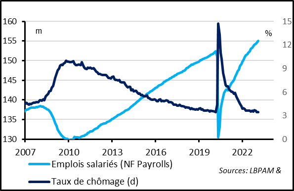 Le taux de chômage a baissé à 3,4%, atteignant son plus bas niveau depuis plus de 50 ans. Le taux de participation a été revu à la hausse de telle sorte que le taux d’emploi, corrigé des changements démographiques, revient pour la première fois à son niveau pré-Covid. Au total, il est clair que le marché de l’emploi américain reste très tendu.