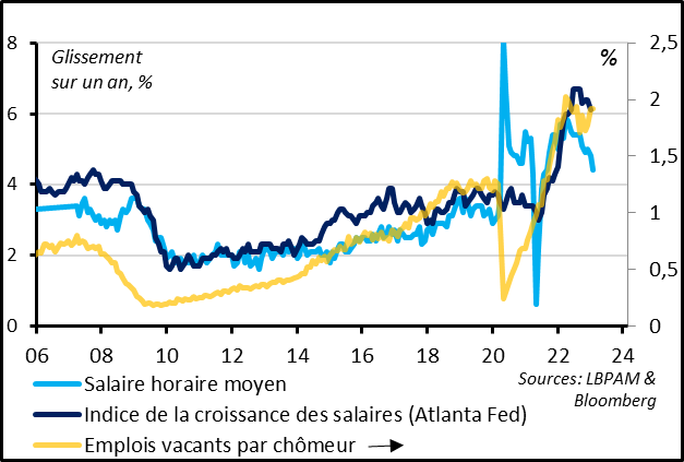 Nous pensons que le ralentissement actuel des salaires vient du fait qu’une partie de l’accélération historique des salaires entre mi-2021 et mi-2022 était probablement temporaire car liée à la réouverture de l’économie post-Covid, et que cette partie temporaire s’estompe maintenant que la réouverture est derrière nous. Mais nous continuons de penser que les pressions salariales resteront trop élevées si le marché du travail ne se détend pas significativement, ce qui devrait requérir un ralentissement net de l’économie américaine. C’est pourquoi nous pensons qu’en l’absence d’une récession significative, la Fed doit maintenir des taux élevés dans les prochains trimestres.