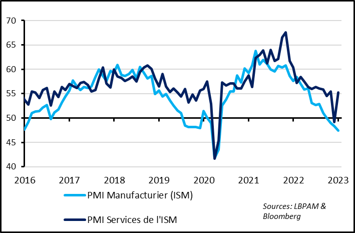 En plus de la résistance de l’emploi américain en janvier, l’indicateur de l’ISM pour services a rebondi à 55,2pt après s’être effondré en décembre à 49,2pt. Il est rassurant que le principal indicateur conjoncturel pour les Etats-Unis repasse en territoire d’expansion de l’activité même s’il reste sur une tendance de décélération depuis début 2022. Au total, il semble que la croissance américaine continue de ralentir en tendance mais ne s’effondre pas début 2023, contrairement à ce qui les indicateurs d’activité de décembre laissaient penser.