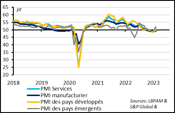 Au-delà des Etats-Unis , la conjoncture mondiale s’améliore un peu début 2023, tirée par la résistance de l’économie de la Zone Euro et la réouverture de la Chine . Ainsi, le PMI composite global s’améliore pour le second mois consécutif en janvier et s’approche de la limite des 50pt. La hausse des PMI est assez généralisée puisque qu’elle concerne l’industrie comme les secteurs des services et les pays émergents comme les pays développés. Elle bénéficie surtout de la Zone Euro et de la Chine, où les PMIs composites de S&P global sont repassés au-dessus des 50pt en janvier pour la première fois depuis l’été. Nous pensons que les perspectives sont meilleures qu’on ne pouvait le craindre dans ces deux zones pour 2023, même si elles restent compliquées .