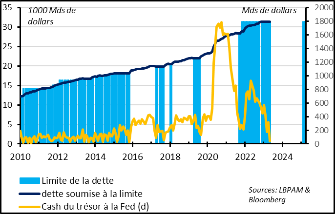 Cela dit, l’accord doit encore être coté par le Congrès. Comme c’est un accord bipartisan cela aurait dû être une formalité. Mais compte tenu des positions extrêmes de certains députés des deux partis, il faut quand même attendre le vote à la chambre avant d’être certain que le deal s’applique (le passage au Sénat devrait suivre plus facilement). L’autre point d’attention est le déluge d’émission de bons du Trésor que devront être émis dans les semaines qui suivront la suspension de la limite de dette. En effet, le Trésor devrait émettre près de 1000 Mds de dollars de bons du trésor pour reconstituer sa réserve de trésorerie, ce qui pourrait mettre un peu de pressions sur les taux courts et renchérir le financement des banques qui sont en compétition pour attirer des dépôts.