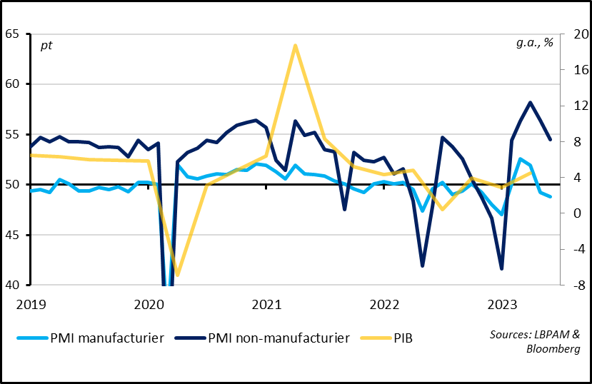 Les PMI officiels chinois baissent nettement en mai pour le second moi consécutif après leur fort rebond au début de l’année, renforçant les incertitudes sur la durabilité de la reprise post-Covid. Le PMI manufacturier baisse encore plus en territoire de contraction, à 48,8pt, à son plus bas niveau depuis le début de la réouverture en décembre. Si la faiblesse de l’activité industrielle reflète en partie la faiblesse du cycle industriel mondial, elle montre aussi que la reprise domestique n’est pas suffisante pour soutenir ce secteur. LE PMI non-manufacturier baisse également nettement en mai, de 2 points à 54,5pt, tout en restant à un niveau relativement élevé. D’un côté, cela montre que le secteur des services continue de se reprendre grâce au rebond de la consommation. Mais cela suggère également que ce rebond s’effrite rapidement. Sans autres relais à la croissance chinoise, la consommation devrait permettre une forte croissance dans la première partie de 2023 mais ne sera probablement pas suffisante pour soutenir une croissance élevée au-delà.