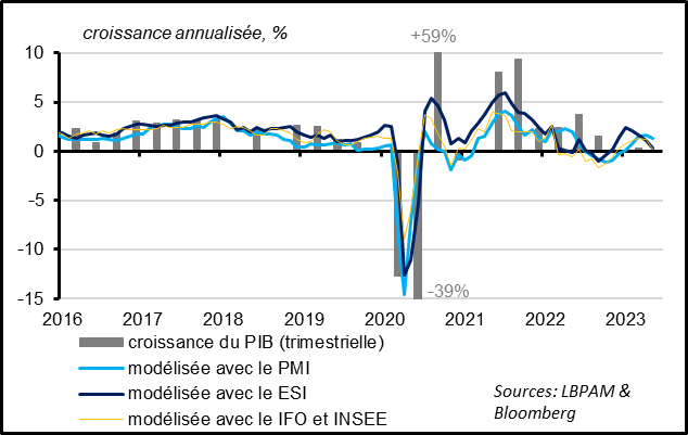 Cela suggère que l’impact du contre-choc énergique est déjà bien intégré par les ménages, après que le choc énergétique de l’année dernière ait massivement pesé sur la consommation cet hiver. La consommation devrait bien rebondir un peu mi-2023 mais le dynamisme de la consommation au-delà dépendra plus du marché de l’emploi. Sur ce point, la poursuite de la hausse de l’emploi et l’accélération des salaires début 2023 (de 3% à 4,3% au T1) sont de bon augure. Cela dit, le resserrement monétaire et la lenteur de la baisse des pressions inflationnistes devraient limiter le dynamisme de la consommation, d’où notre prévision du croissance positive mais faible de la Zone Euro dans les prochains trimestres.