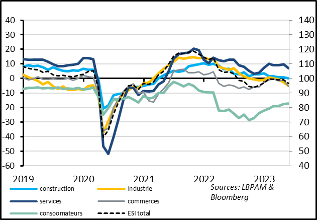 Fig. 6 Zone Euro : la confiance reste élevée dans les services mais diminue dans l’ensemble des autres secteurs de l’économie