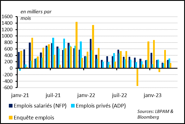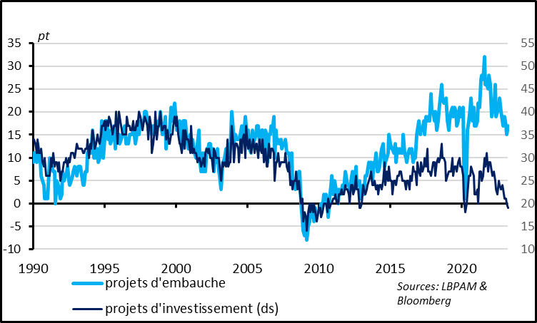 Au total, la stratégie de la Fed semble marcher même si elle prend du temps : les conditions de crédit se resserrent nettement, les perspectives d’investissement et d’emploi commencent à se dégrader ce qui devrait finir par peser suffisamment sur la demande pour faire ralentir les pressions inflationnistes et sur les salaires. Cela va dans le sens du discours de la Fed de la semaine dernière : le resserrement monétaire déjà réalisé est probablement suffisant mais il doit être maintenu pendant plusieurs trimestres pour permettre un retour durable des tensions économiques vers des niveaux acceptables. Et le risque est qu’il fasse remonter les taux encore plus hauts après une pause, si la consommation et les revenus salariaux ne ralentissent pas suffisamment dans les prochains mois.