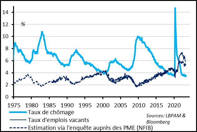 Au total, il semble bien que le marché du travail commence à se détendre mais qu’il reste encore bien plus tendu qu’au cours des dernières décennies. En effet, le nombre d’emplois vacants par chômeur, une mesure souvent citée par Jérôme Powell, a baissé de 2 à 1,7 depuis un an, ce qui reste nettement au-dessus de son niveau pré-Covid de 1,3.