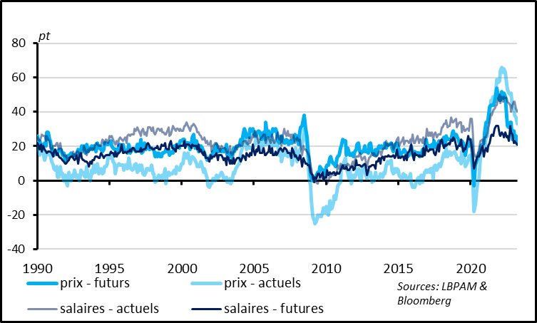 Côté prix et salaires, les réponses des PME sont en ligne avec l’idée que l’inflation et les salaires vont ralentir, mais seulement graduellement. Les PME indiquent que les hausses de prix et de salaires restent élevées, plus importantes que lors des 40 ans précédents le Covid, mais qu’elles ralentissent par rapport aux deux dernières années. Surtout, les PME anticipent que les hausses de prix et de salaires vont revenir vers leur niveau pré-Covid dans les prochains mois. Si nous pensons que le ralentissement des salaires et de l’inflation dans les services devrait être plus lent que cela, c’est rassurant car il n’y a pas de signe d’enclenchement d’une boucle prix-salaires.