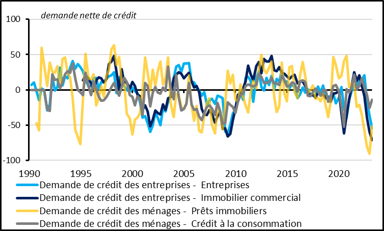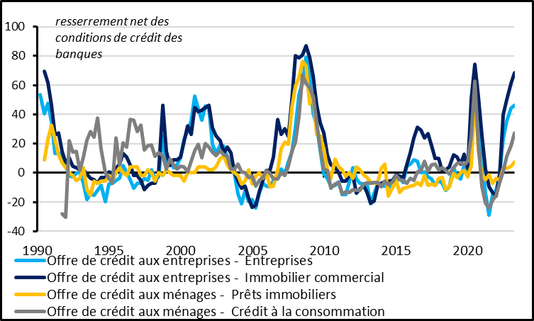 D’un côté, les banques indiquent que les conditions de crédit se durcissent de nouveau nettement début 2023 et devraient continuer de se durcir au cours de l’année, côté offres de prêts comme côté demandes de prêts. C’est en particulier le cas pour les entreprises et encore plus pour l’immobilier commercial. Cela suggère que la politique monétaire va bien peser sur la croissance du crédit et de l’activité dans les prochains trimestres.