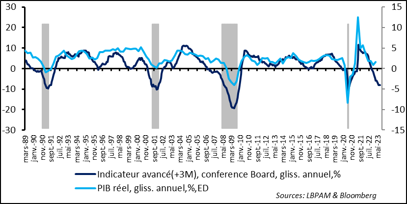 Fig. 2 Etats-Unis: L’indicateur avancé du Conference Board reste à des niveaux de récession et donne ainsi un signe d’affaiblissement de l’activité dans les mois à venir.