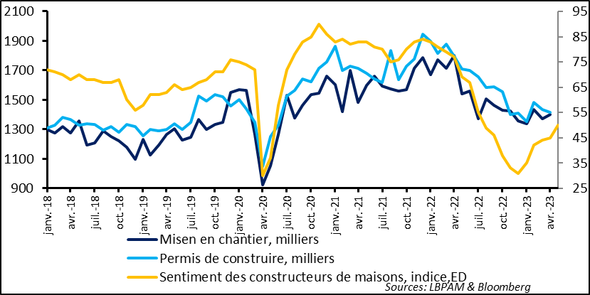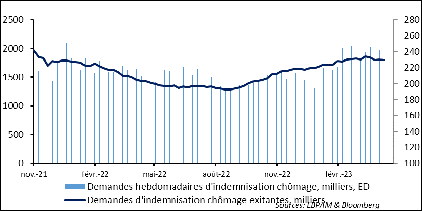 - Du point de vue conjoncturel, on continue à avoir des données qui pointent vers un affaiblissement de l’activité mais pas de manière homogène. Au niveau global, à lire l’évolution des prix des matières premières, notamment du pétrole et du cuivre, on voit que les anticipations de faiblesse de la demande dans le monde développé et une reprise poussive de l’industrie en Chine pèsent sur les cours. Aussi, aux Etats-Unis, l’indicateur avancé du Conférence Board, sans se détériorer davantage, continue de donner un message de faiblesse, cohérent avec des périodes de récession par le passé. En même temps, le secteur le plus sensible à la hausse des taux, le secteur de la construction, après le fort ajustement de 2022, s’est stabilisé, avec même un rebond de l’indice de confiance des constructeurs, même si à partir de niveaux très faibles. En outre, sur le marché de l’emploi, la poussée des demandes d’allocation chômage, après avoir montré une tendance haussière très nette, fait preuve d’une certaine stabilité récemment, d’autant plus qu’elle a été perturbée récemment par des fraudes qui avaient gonflé les statistiques. Nous pensons toujours que la détérioration de la conjoncture devrait se poursuivre, mais sans ajustement extrêmement sévère.